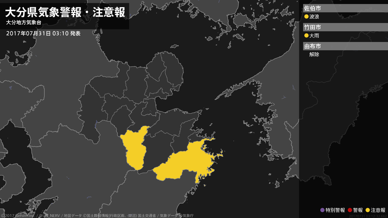 【大分県 気象警報(解除) 2017年07月31日 03:12】大分県に発表されていた気象警報はすべて解除されました。西部では、土砂災害に注意してください。南部では、高波に注意してください。#気象警報 #大分県