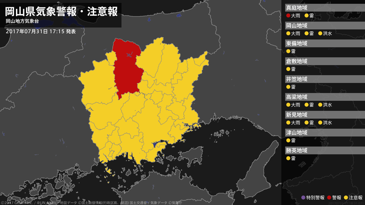 気象庁によりますと、愛媛県の大洲市付近では午後4時20分までの1時間に、内子町付近では午後4時半までの1時間に、いずれもレーダーによる解析でおよそ100ミリの猛烈な雨が降ったとみられます。また、内子町の獅子越峠では、午後4時半までの1時間にアメダスの観測点で100.5ミリの猛烈な雨を観測しました。災害の危険が迫っていることから、気象庁は「記録的短時間大雨情報」を発表して安全を確保するよう呼びかけています。