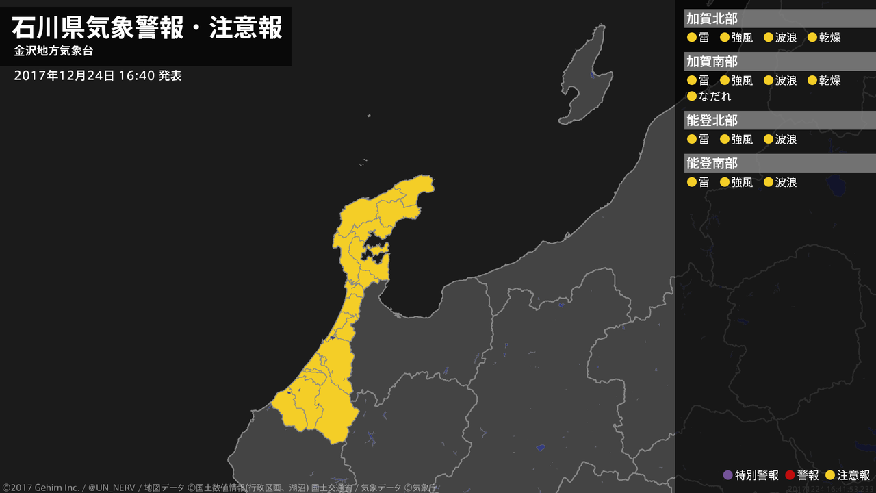 【石川県 気象警報・注意報 2017年12月24日 16:43】石川県では、強風や高波、落雷に注意してください。加賀では、空気の乾燥による火の取り扱いやなだれに注意してください。#気象警報注意報 #石川県