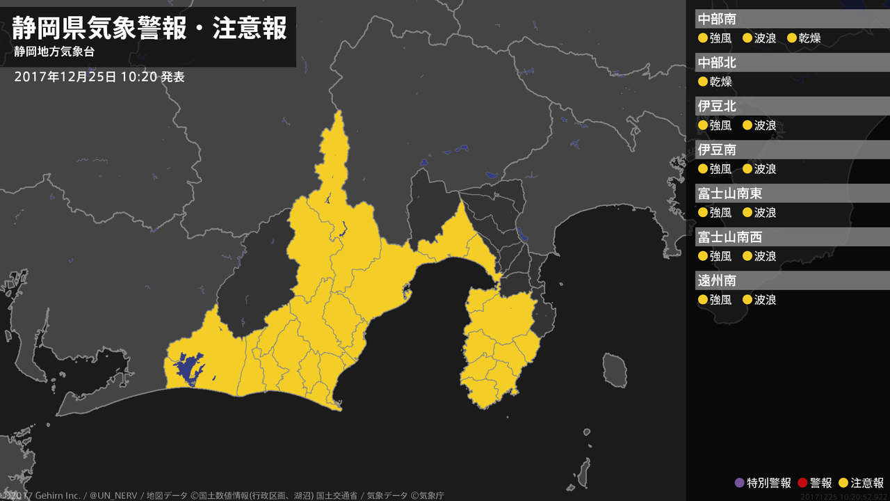【静岡県 気象警報・注意報 2017年12月25日 10:21】静岡県では、強風や高波に注意してください。中部では、空気の乾燥による火の取り扱いに注意してください。#気象警報注意報 #静岡県