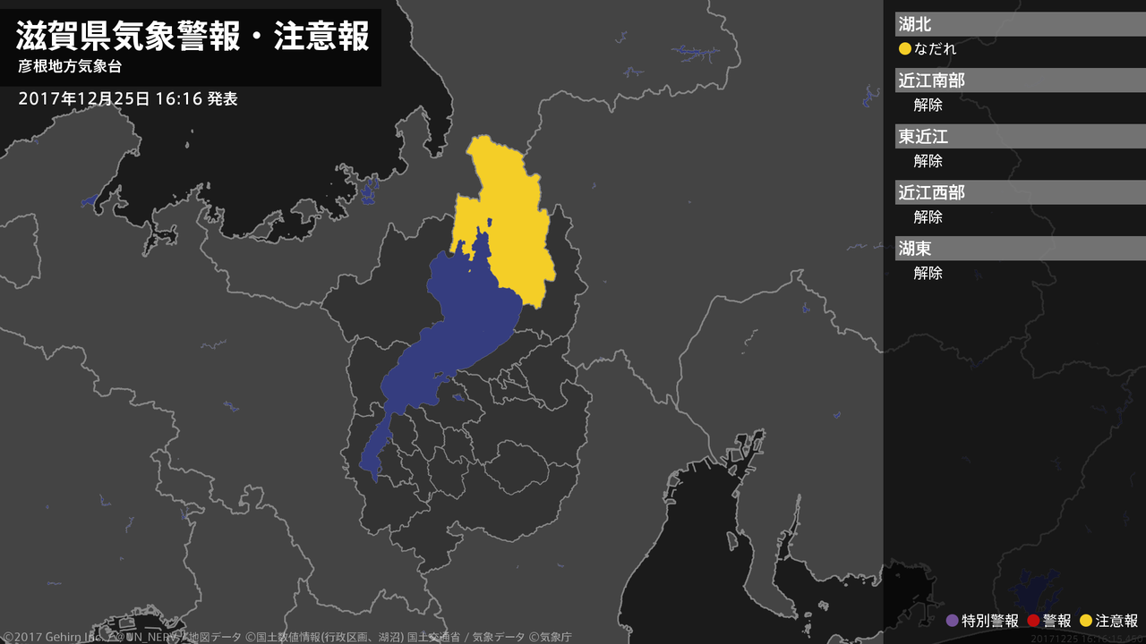 【滋賀県 気象警報・注意報 2017年12月25日 16:16】北部では、27日までなだれに注意してください。#気象警報注意報 #滋賀県