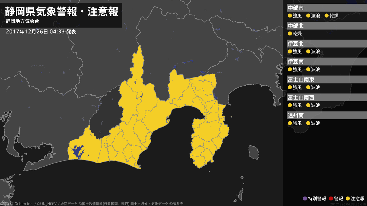 【静岡県 気象警報・注意報 2017年12月26日 04:33】静岡県では、強風や高波に注意してください。中部では、空気の乾燥による火の取り扱いに注意してください。#気象警報注意報 #静岡県