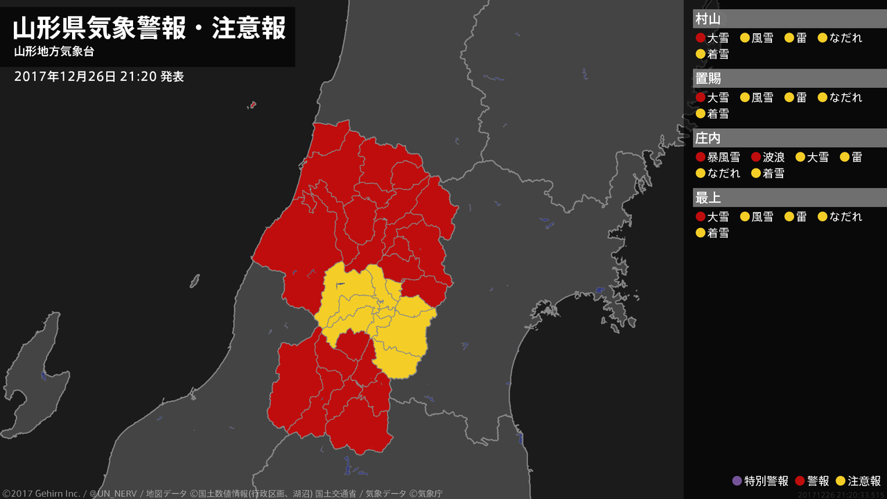 【山形県 気象警報 2017年12月26日 21:20】庄内では、暴風雪や高波に警戒してください。村山、置賜、最上では、大雪に警戒してください。#気象警報 #気象警報注意報 #山形県