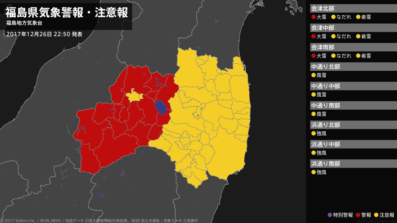 【福島県 気象警報 2017年12月26日 22:51】会津では、27日夕方まで大雪に警戒してください。#気象警報 #気象警報注意報 #福島県