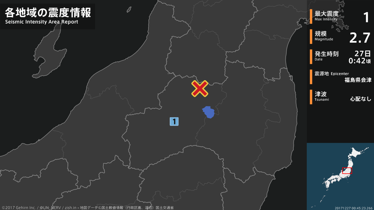 【地震情報 2017年12月27日】00時42分頃、福島県会津を震源とする地震がありました。震源の深さは約10km、地震の規模はM2.7、最大震度1を福島県で観測しています。この地震による津波の心配はありません。#地震 #福島県