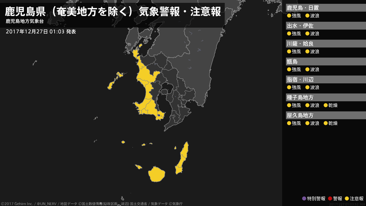 【鹿児島県(奄美地方を除く) 気象警報・注意報 2017年12月27日 01:04】薩摩、種子島・屋久島地方では、強風や高波に注意してください。種子島・屋久島地方では、空気の乾燥による火の取り扱いに注意してください。#気象警報注意報 #鹿児島県(奄美地方除く)