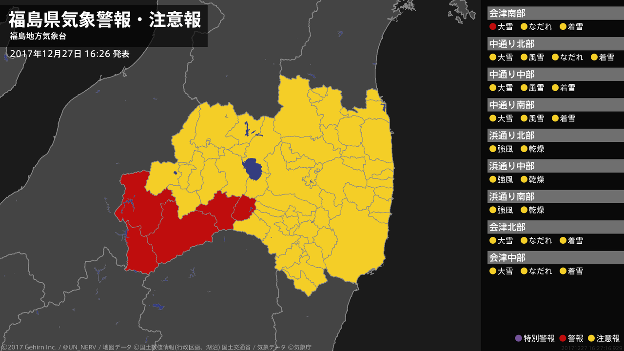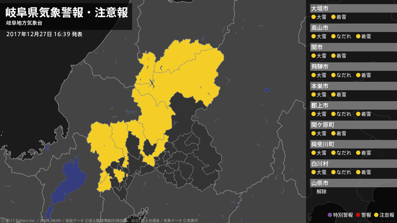 【岐阜県 気象警報・注意報 2017年12月27日 16:39】