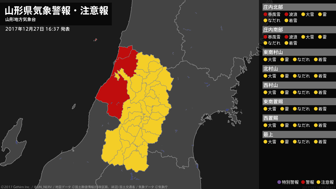【山形県 気象警報・注意報 2017年12月27日 16:37】