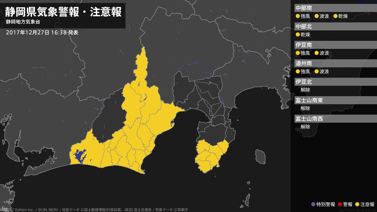 【静岡県 気象警報・注意報 2017年12月27日 16:43】中部、伊豆、西部では、強風や高波に注意してください。中部では、空気の乾燥による火の取り扱いに注意してください。#気象警報注意報 #静岡県