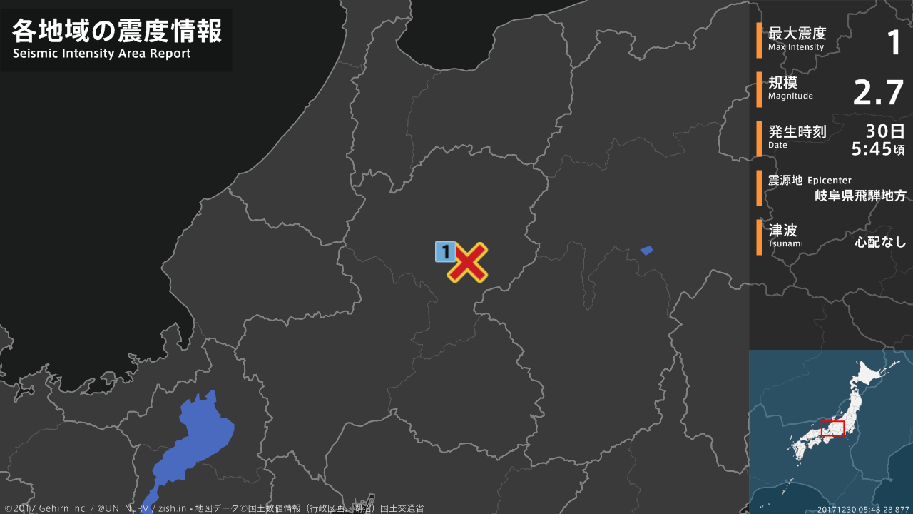 【地震情報 2017年12月30日】05時45分頃、岐阜県飛騨地方を震源とする地震がありました。震源の深さは約10km、地震の規模はM2.7、最大震度1を岐阜県で観測しています。この地震による津波の心配はありません。#地震 #岐阜県