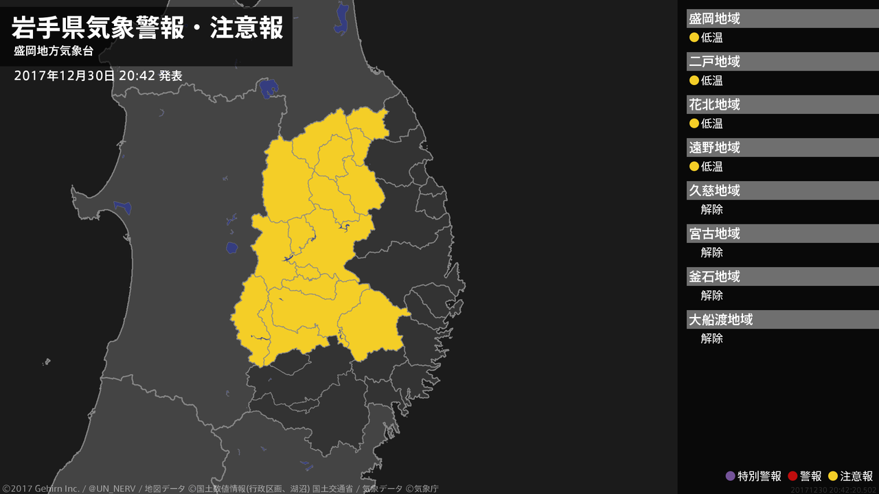 【岩手県 気象警報・注意報 2017年12月30日 20:42】
