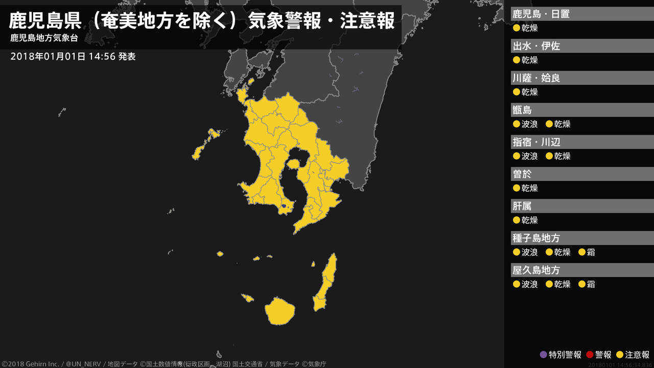 【鹿児島県(奄美地方を除く) 気象警報・注意報 2018年01月01日 14:56】薩摩、種子島・屋久島地方では高波に、薩摩、大隅、種子島・屋久島地方では空気の乾燥による火の取り扱いに、種子島・屋久島地方では霜に対する農作物の管理に注意してください。#気象警報注意報 #鹿児島県(奄美地方除く)