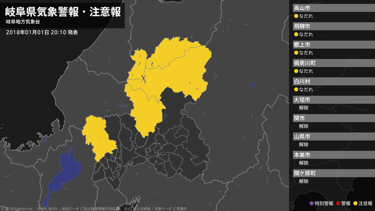 【岐阜県 気象警報・注意報 2018年01月01日 20:10】岐阜県では、ここしばらくなだれに注意してください。#気象警報注意報 #岐阜県