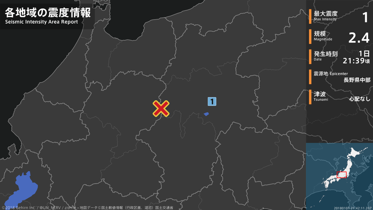 【地震情報 2018年1月1日】21時39分頃、長野県中部を震源とする地震がありました。震源の深さは約10km、地震の規模はM2.4、最大震度1を長野県で観測しています。この地震による津波の心配はありません。#地震 #長野県