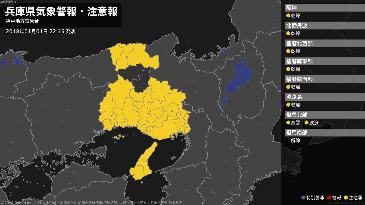 【兵庫県 気象警報・注意報 2018年01月01日 22:35】北部では、風雪や高波に注意してください。南部では、空気の乾燥による火の取り扱いに注意してください。#気象警報注意報 #兵庫県