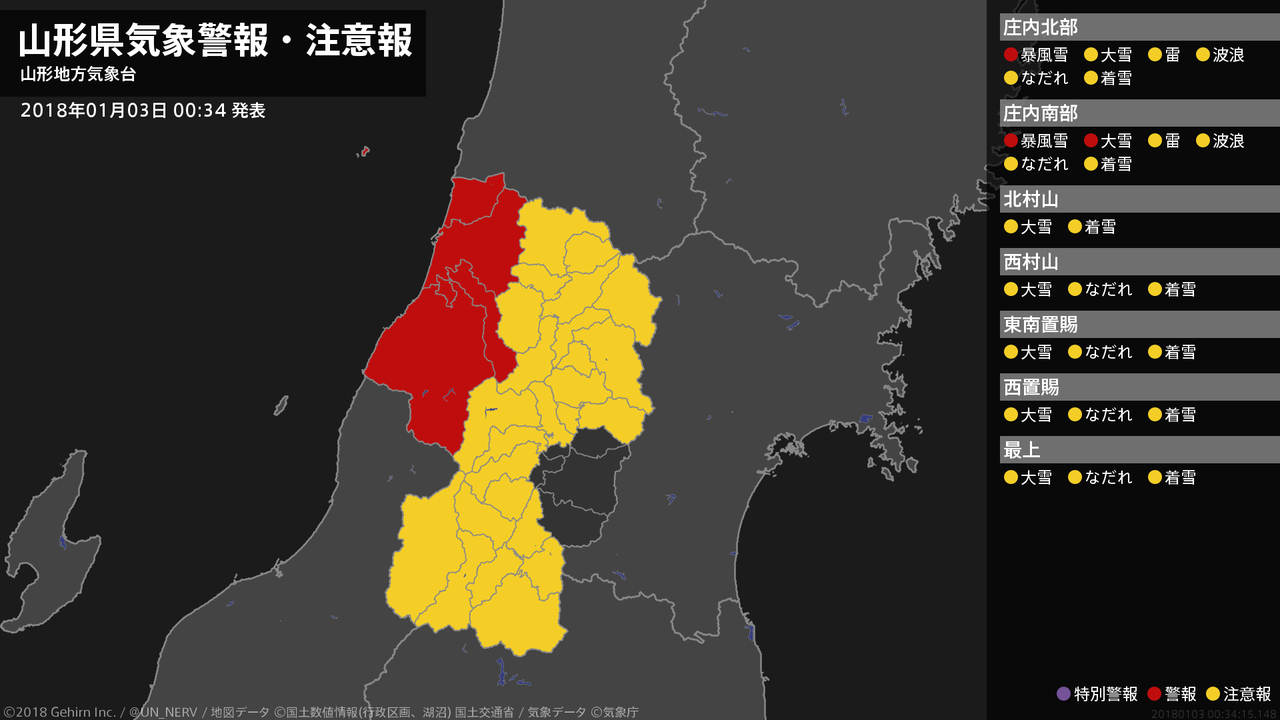 庄内では、3日朝から3日夕方まで暴風雪に、3日昼過ぎまで大雪に警戒してください。