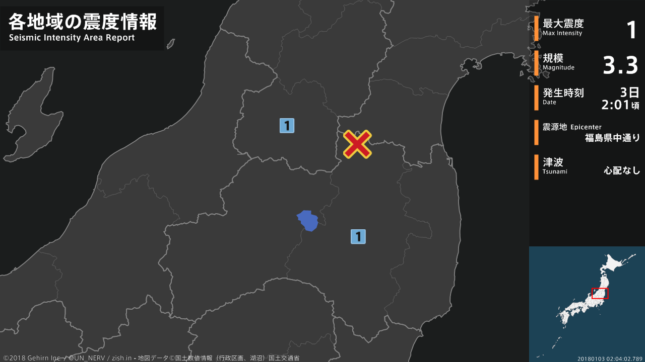02時01分頃、福島県中通りを震源とする地震がありました。震源の深さは約10km、地震の規模はM3.3、最大震度1を山形県、福島県で観測しています。この地震による津波の心配はありません。
