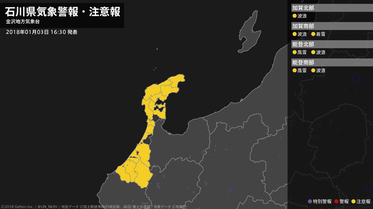 【石川県 気象警報(解除) 2018年01月03日 16:31】石川県に発表されていた気象警報はすべて解除されました。#気象警報 #石川県