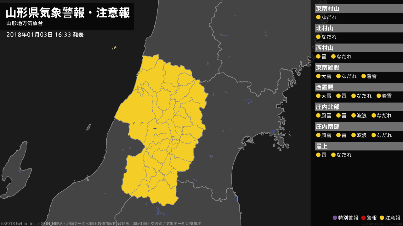 【山形県 気象警報(解除) 2018年01月03日 16:35】山形県に発表されていた気象警報はすべて解除されました。#気象警報 #山形県