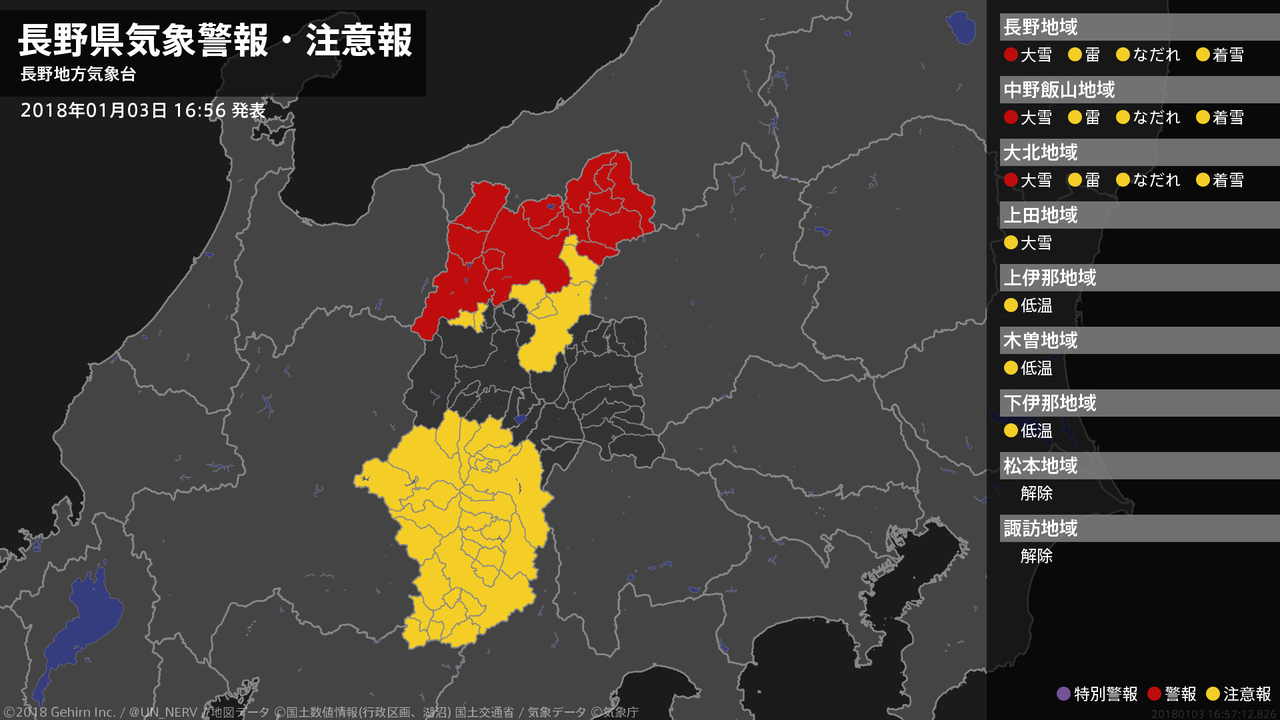【長野県 気象警報・注意報 2018年01月03日 16:57】北部では、3日夜遅くまで大雪に警戒してください。#気象警報注意報 #長野県