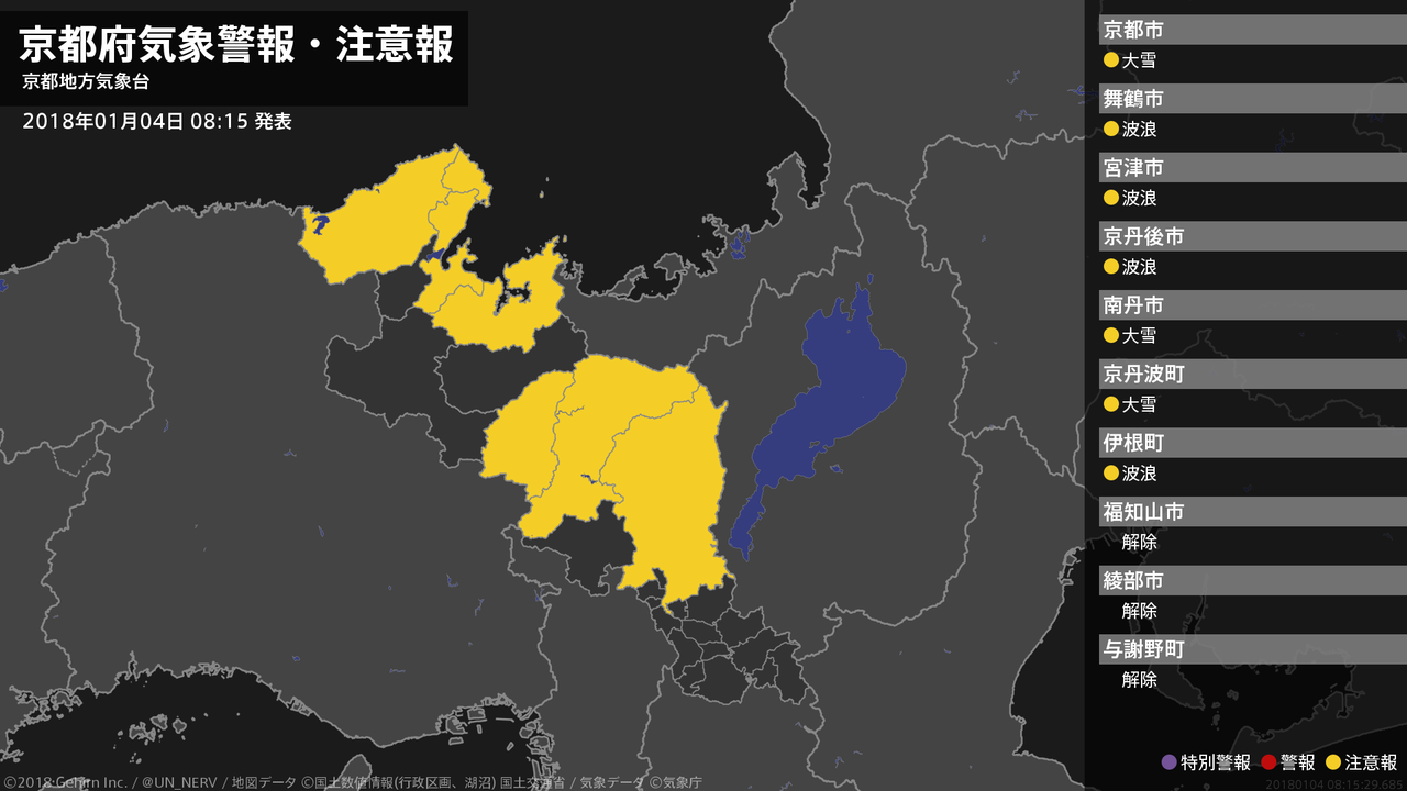 【京都府 気象警報・注意報 2018年01月04日 08:15】南部では、4日昼過ぎまで大雪に注意してください。北部では、4日夕方まで高波に注意してください。#気象警報注意報 #京都府