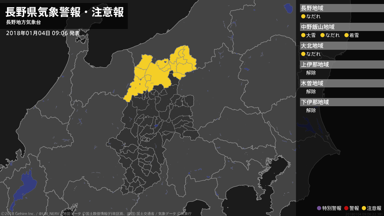 【長野県 気象警報・注意報 2018年01月04日 05:03】北部では、4日夕方まで大雪や電線等への着雪に、5日までなだれに注意してください。南部では、4日まで低温に注意してください。#気象警報注意報 #長野県