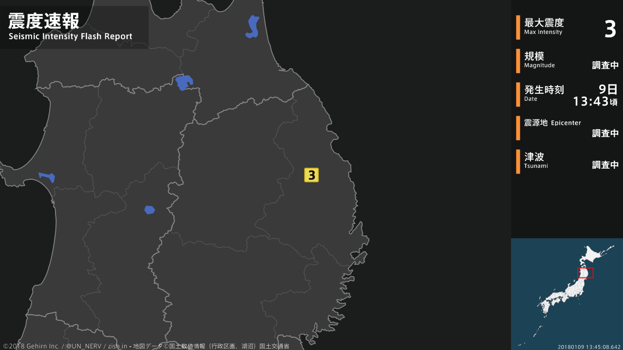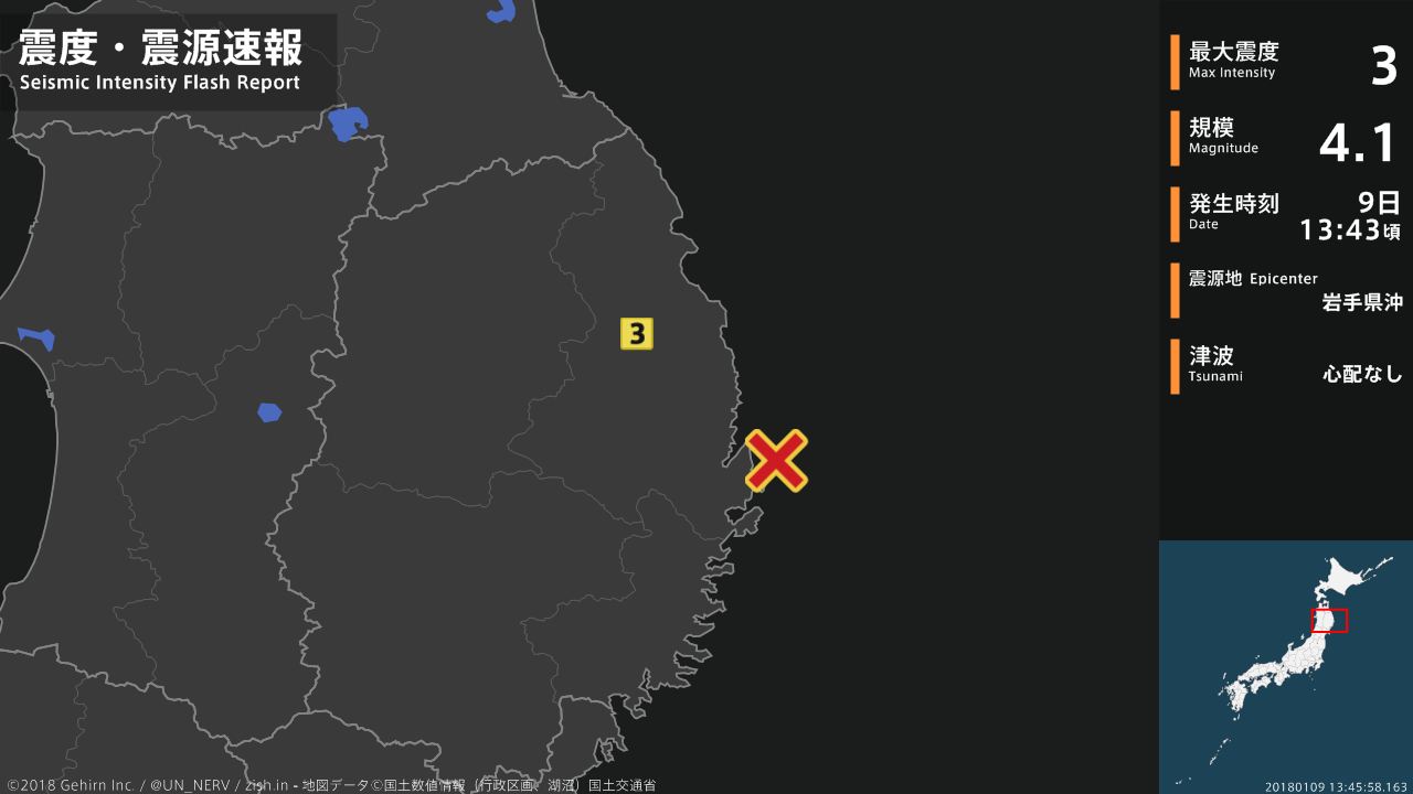 9日13時43分頃、岩手県沖を震源とする地震がありました。震源の深さは約50km、地震の規模はM4.1と推定されています。この地震による津波の心配はありません。