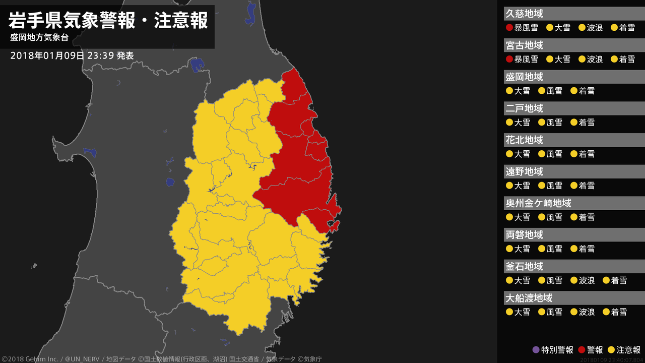 【岩手県 気象警報・注意報 2018年01月09日 23:40】