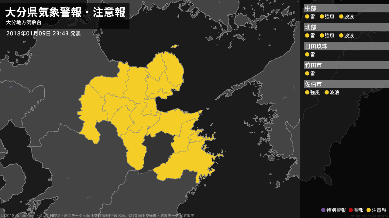 【大分県 気象警報・注意報 2018年01月09日 23:43】