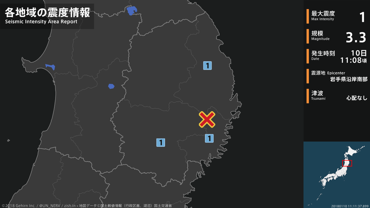 【地震情報 2018年1月10日】11時08分頃、岩手県沿岸南部を震源とする地震がありました。震源の深さは約70km、地震の規模はM3.3、最大震度1を岩手県で観測しています。この地震による津波の心配はありません。#地震 #岩手県