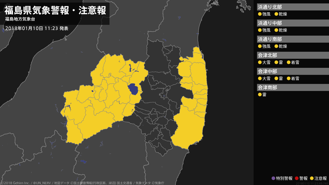 【福島県 気象警報・注意報 2018年01月10日 11:24】浜通りでは、強風や空気の乾燥による火の取り扱いに注意してください。会津では、大雪や落雷、電線等への着雪に注意してください。#気象警報注意報 #福島県