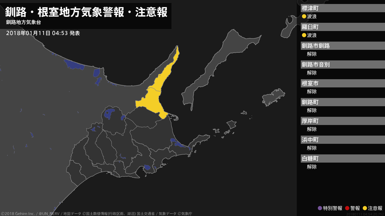 【釧路・根室地方 気象警報・注意報 2018年01月11日 04:54】