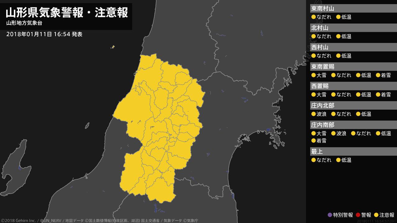 【山形県 気象警報・注意報 2018年01月11日 16:55】