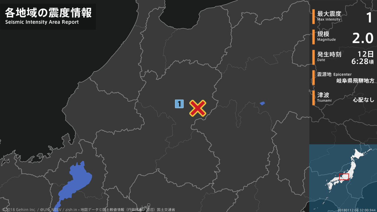 【地震情報 2018年1月12日】06時28分頃、岐阜県飛騨地方を震源とする地震がありました。震源の深さはごく浅い、地震の規模はM2.0、最大震度1を岐阜県で観測しています。この地震による津波の心配はありません。#地震 #岐阜県