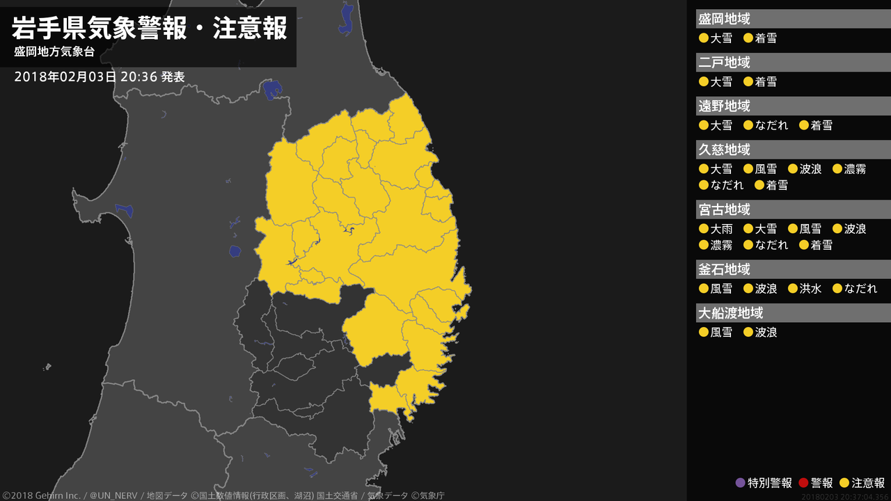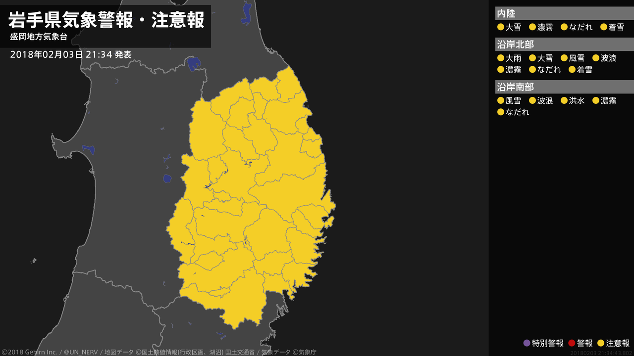 【岩手県 気象警報・注意報 2018年02月03日 21:34】岩手県では、土砂災害や河川の増水、風雪、大雪、高波、濃霧による視程障害、なだれ、電線等への着雪に注意してください。#気象警報注意報 #岩手県
