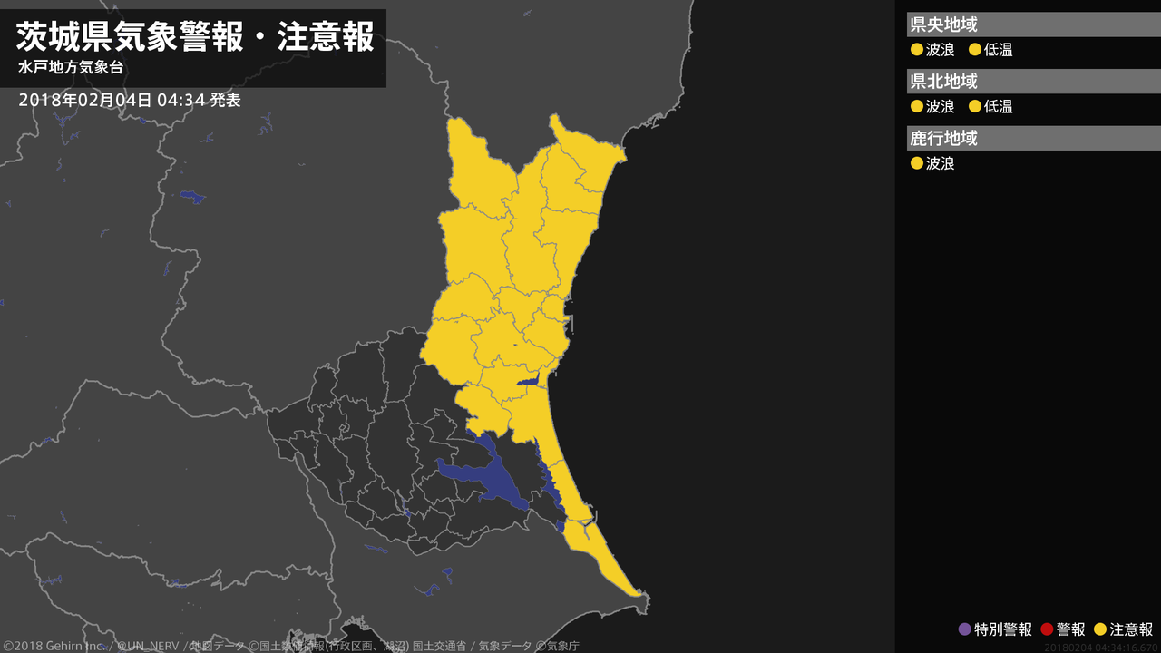 【茨城県 気象警報・注意報 2018年02月04日 04:34】茨城県では、5日明け方まで高波に注意してください。北部では、4日まで低温に注意してください。#気象警報注意報 #茨城県