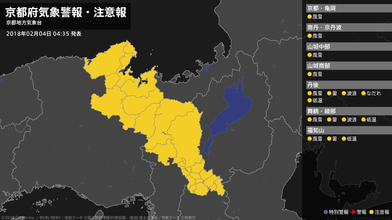 【京都府 気象警報・注意報 2018年02月04日 04:36】京都府では、風雪に注意してください。北部では、高波や落雷、なだれ、低温に注意してください。#気象警報注意報 #京都府
