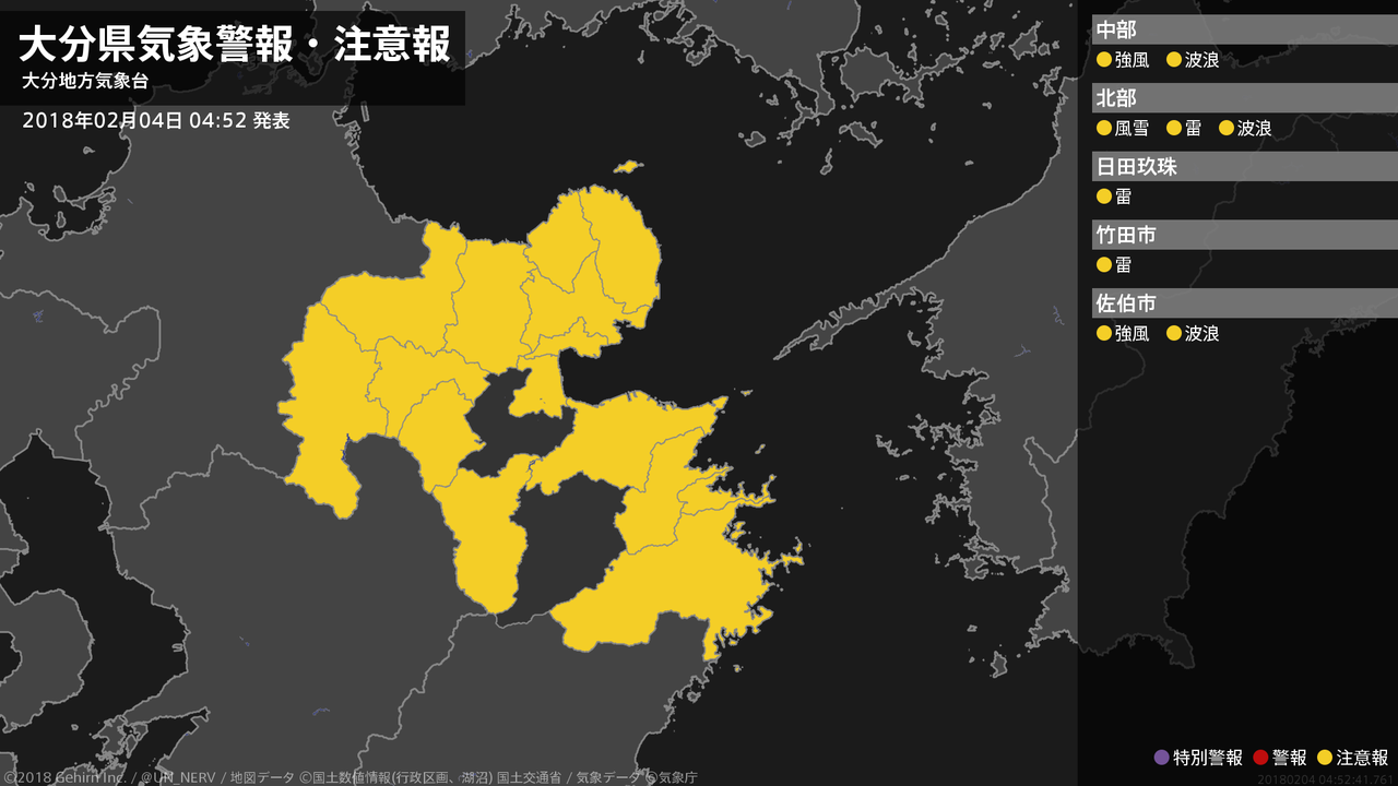 【大分県 気象警報・注意報 2018年02月04日 04:52】中部、南部では、強風に注意してください。北部では、風雪に注意してください。中部、北部、南部では、高波に注意してください。北部、西部では、落雷に注意してください。#気象警報注意報 #大分県