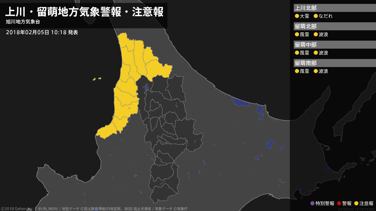 【上川・留萌地方 気象警報・注意報 2018年02月05日 10:18】留萌地方では、6日明け方まで風雪に、5日夕方まで高波に注意してください。上川地方では、5日夕方まで大雪に、6日までなだれに注意してください。#気象警報注意報 #上川地方 #留萌地方