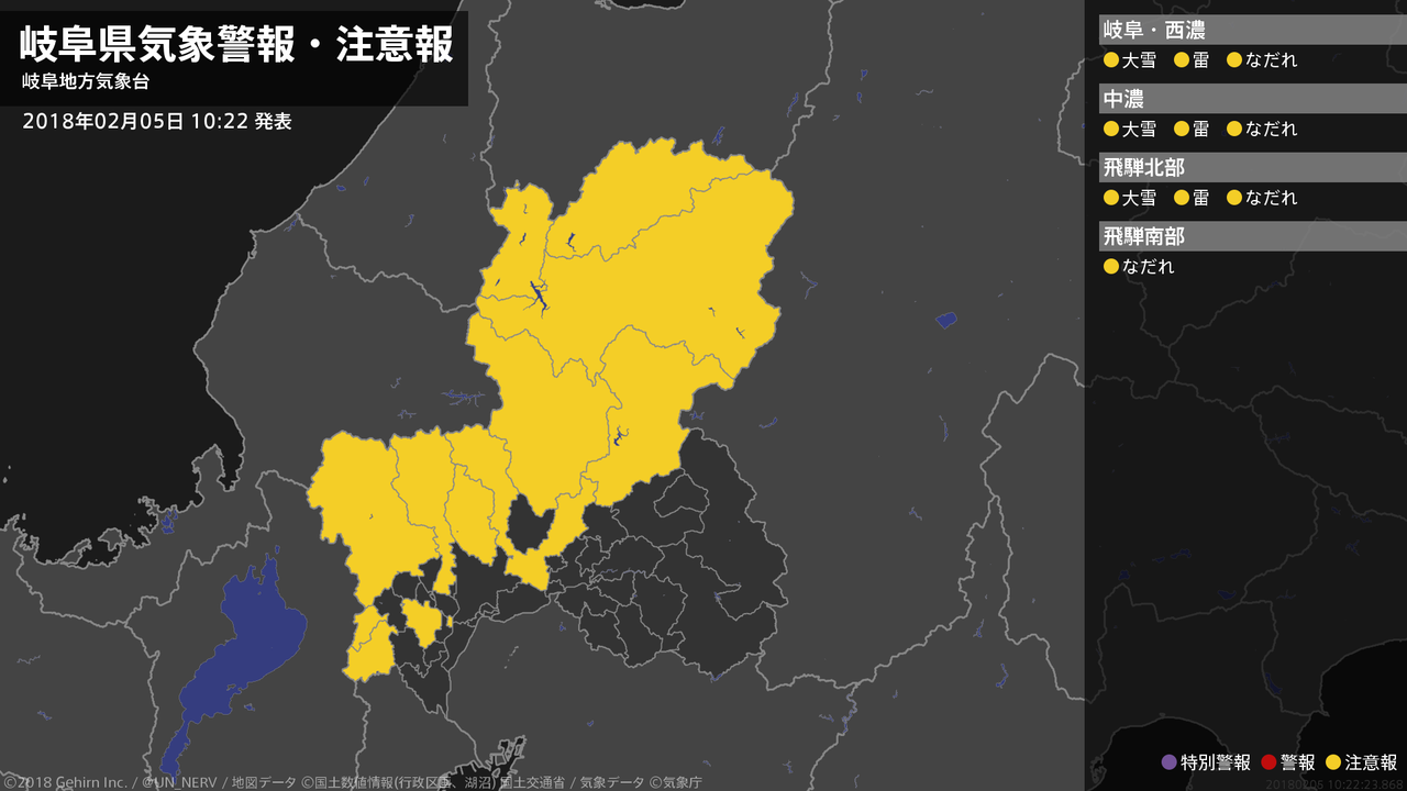 【岐阜県 気象警報・注意報 2018年02月05日 10:22】岐阜県では、大雪や落雷、なだれに注意してください。#気象警報注意報 #岐阜県