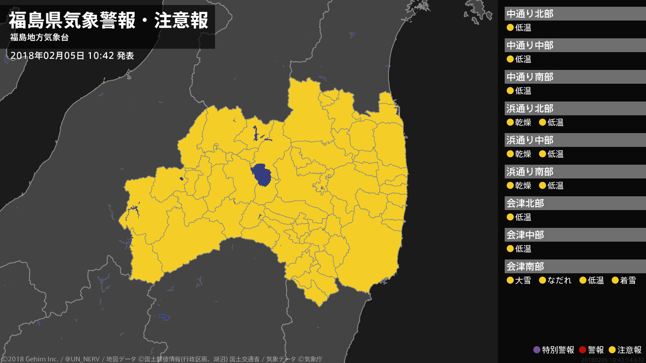 【福島県 気象警報・注意報 2018年02月05日 10:42】会津では、大雪やなだれ、電線等への着雪に注意してください。浜通りでは、空気の乾燥による火の取り扱いに注意してください。福島県では、低温に注意してください。#気象警報注意報 #福島県