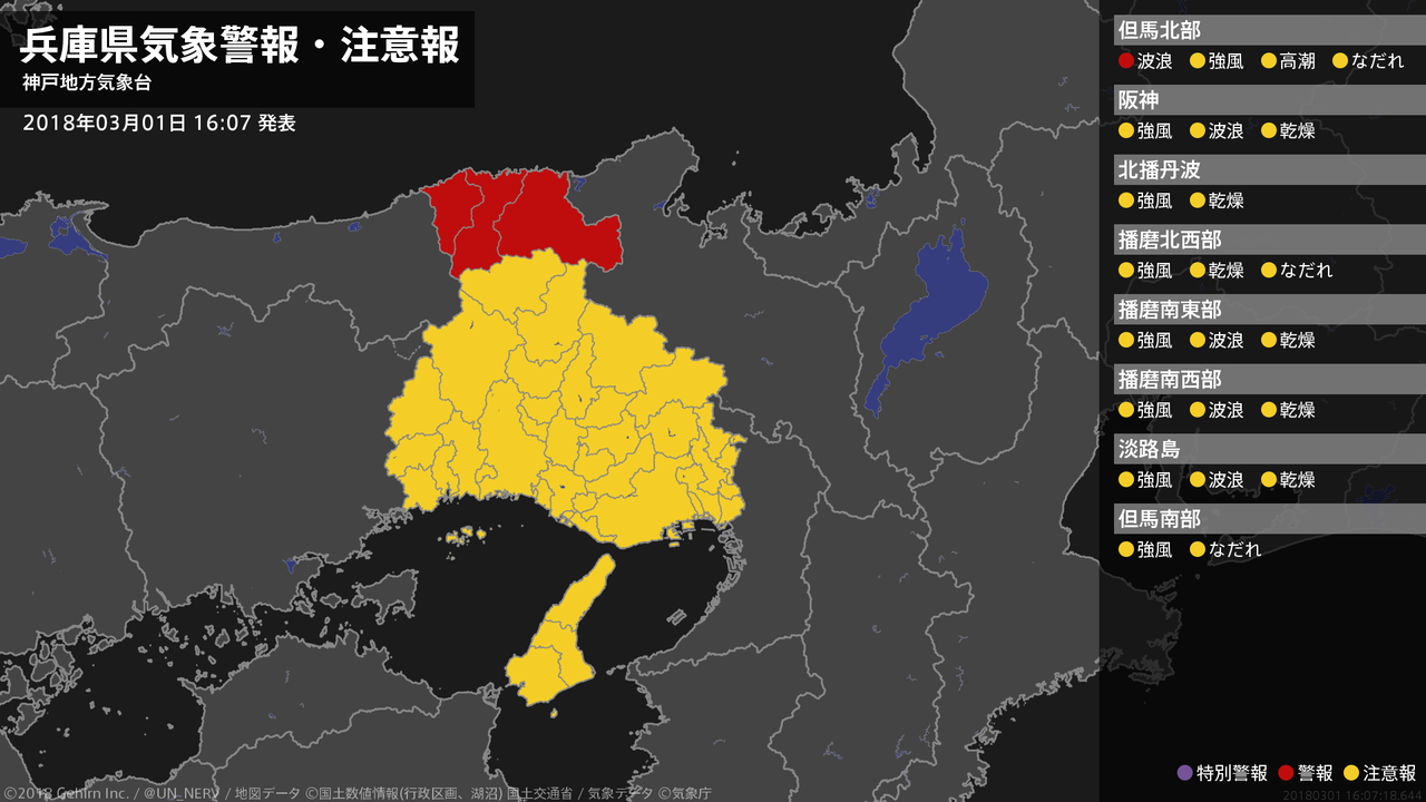 【兵庫県 気象警報・注意報 2018年03月01日 16:07】