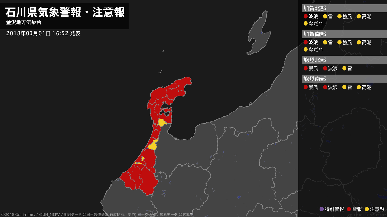 【石川県 気象警報 2018年03月01日 16:52】能登では、暴風に警戒してください。石川県では、高波に警戒してください。#気象警報 #気象警報注意報 #石川県