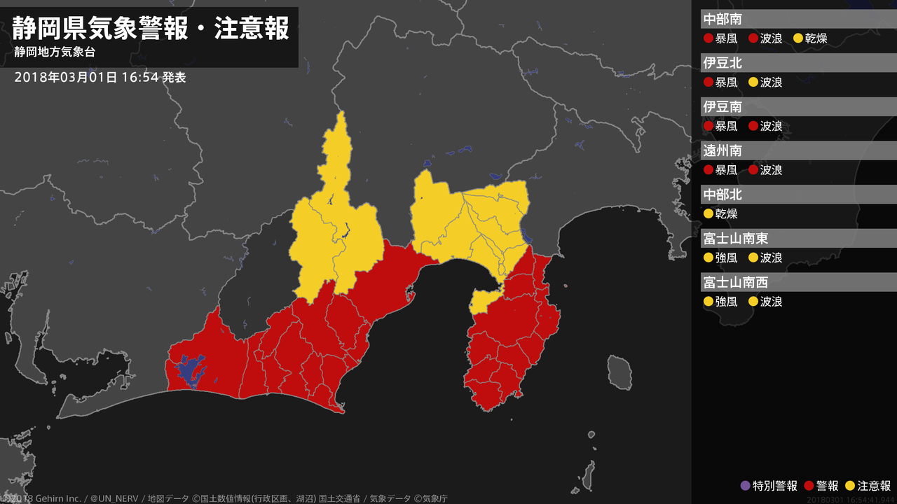 【静岡県 気象警報・注意報 2018年03月01日 16:54】中部、西部では1日夜のはじめ頃まで、伊豆では2日明け方まで、暴風に警戒してください。中部、伊豆、西部では、1日夜のはじめ頃まで高波に警戒してください。#気象警報注意報 #静岡県