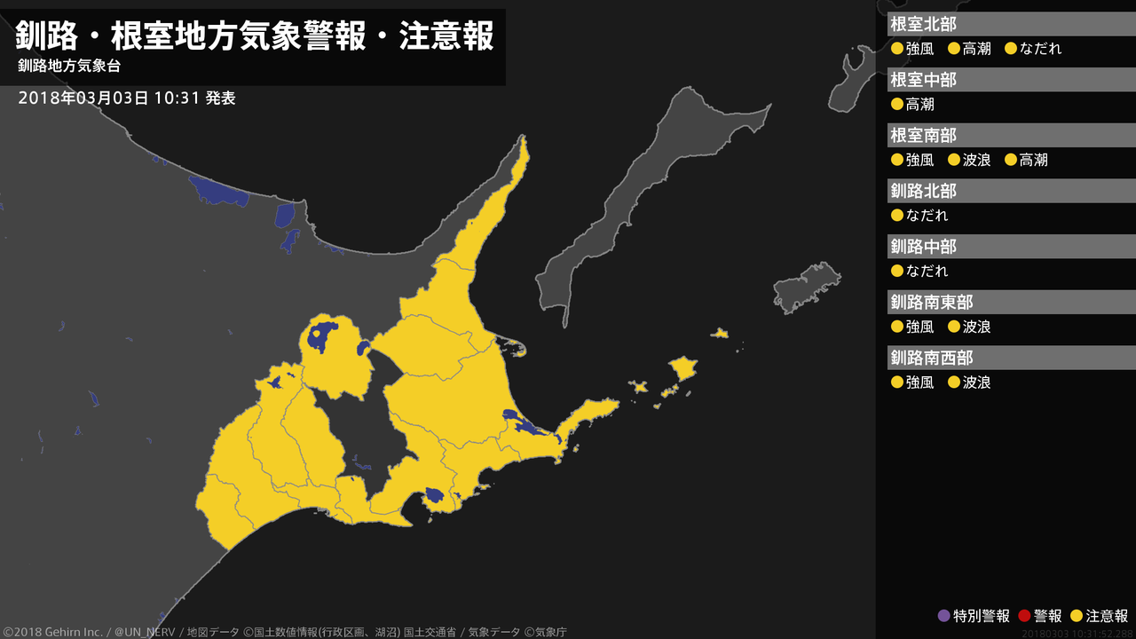 【釧路・根室地方 気象警報・注意報 2018年03月03日 10:31】根室、釧路地方では、3日夕方まで強風や高波に、4日までなだれに注意してください。根室地方では、3日昼過ぎから3日夕方まで高潮に注意してください。#気象警報注意報 #根室地方 #釧路地方