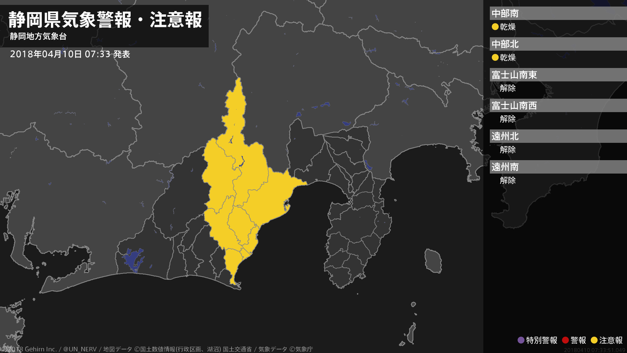 【静岡県 気象警報・注意報 2018年04月10日 07:34】中部では、10日まで空気の乾燥による火の取り扱いに注意してください。#気象警報注意報 #静岡県