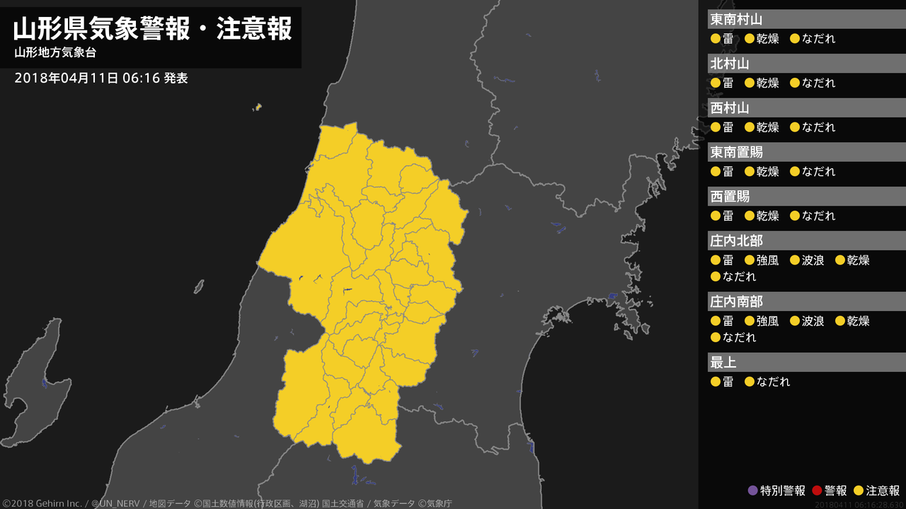 【山形県 気象警報・注意報 2018年04月11日 06:16】庄内では、強風や高波に注意してください。山形県では、落雷やなだれに注意してください。村山、置賜、庄内では、空気の乾燥による火の取り扱いに注意してください。#気象警報注意報 #山形県