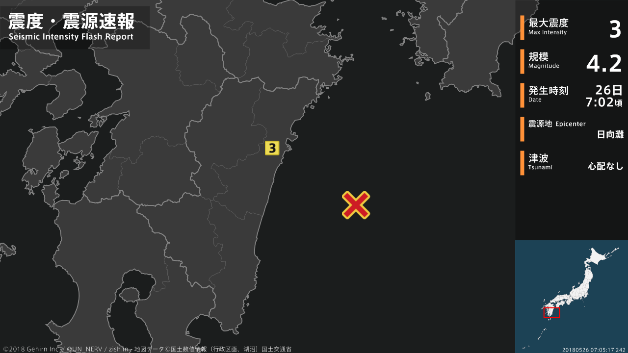 26日07時02分頃、日向灘を震源とする地震がありました。震源の深さは約20km、地震の規模はM4.2と推定されています。この地震による津波の心配はありません。