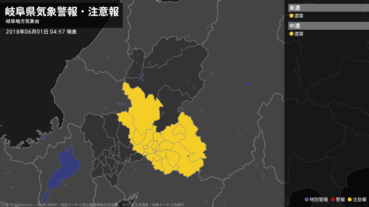 【岐阜県 気象警報・注意報 2018年06月01日 04:57】美濃地方では、1日昼前まで濃霧による視程障害に注意してください。#気象警報注意報 #岐阜県
