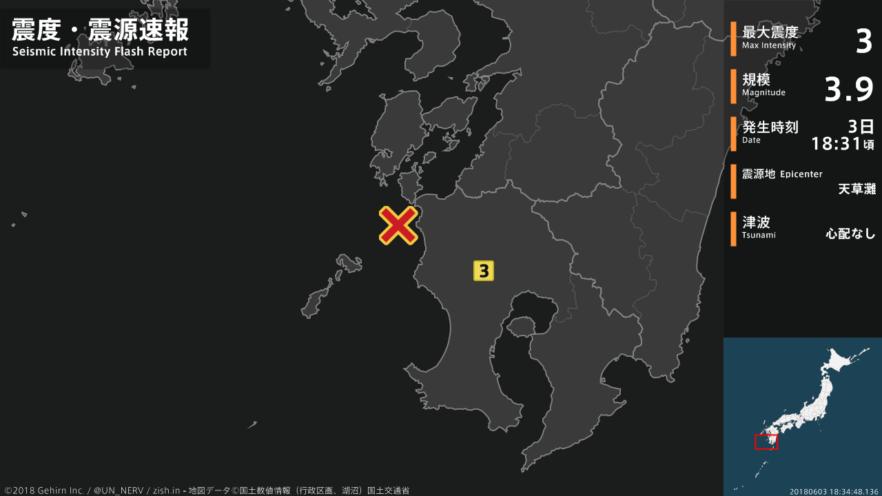 3日18時31分頃、天草灘を震源とする地震がありました。震源の深さは約10km、地震の規模はM3.9と推定されています。この地震による津波の心配はありません。